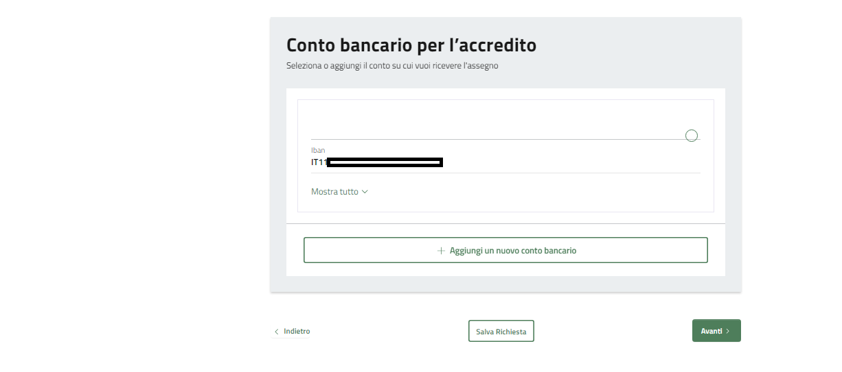 In caso non ci sia cliccare su "Aggiungi un nuovo conto bancario" mentre nel caso l'IBAN riportato sia errato o non aggiornato cliccare su "Mostra tutto" e poi "Modifica"