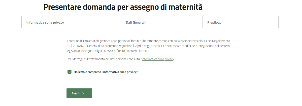 Il primo passo per richiedere l'erogazione dell'assegno di maternità è l'accettazione dell'informativa privacy.