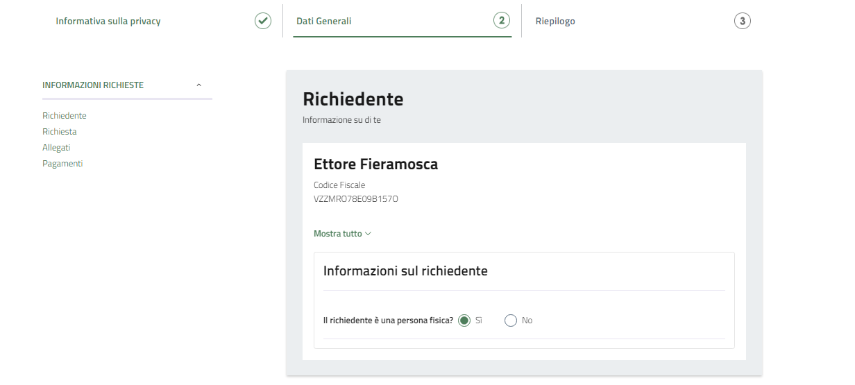Indicare per conto di chi o cosa si sta presentando l'istanza.