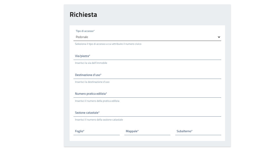 Indicare la tipologia di accesso, Pedonale o Carraio, precisando indirizzo, destinazione d'uso e numero della pratica edilizia oltre ai dati catastali.