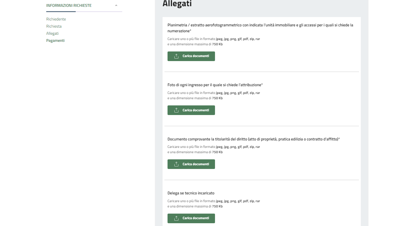 Caricare la planimetria e le foto richieste cliccando su "carica contenuti" e selezionandole dal proprio dispositivo.
