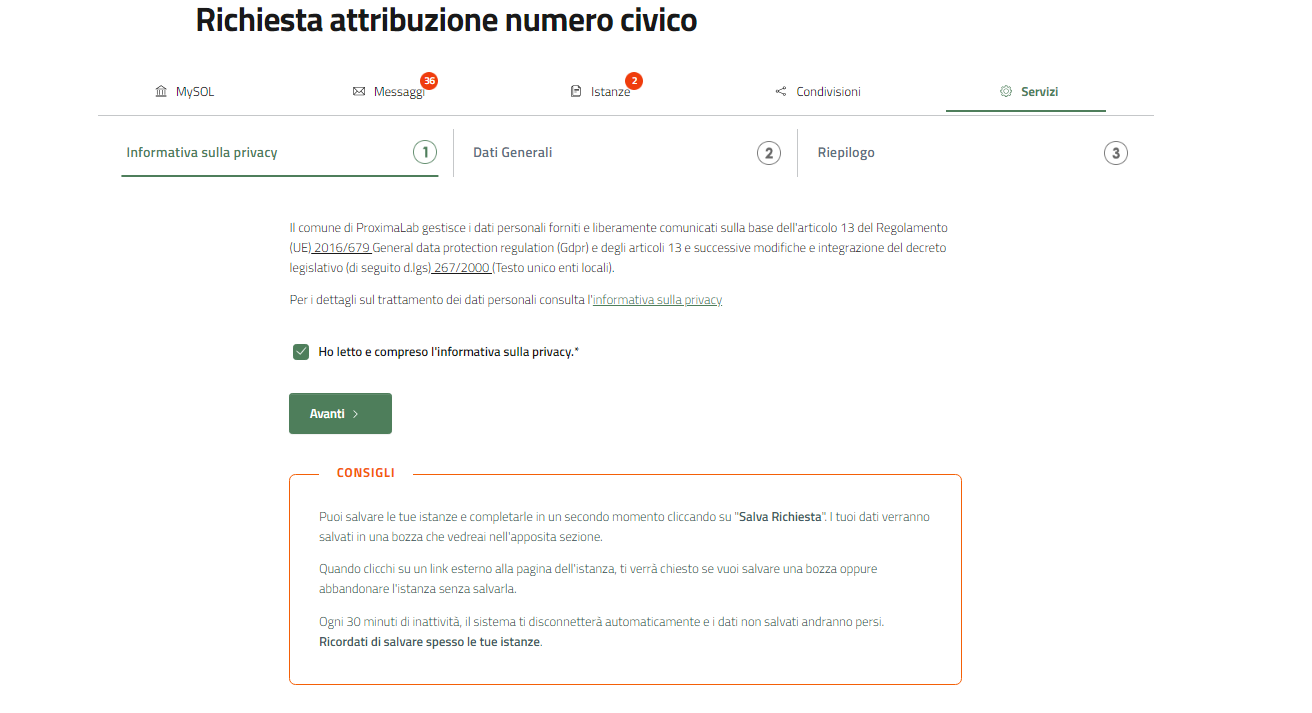 Il primo passo per richiedere l'attribuzione di un numero civico, è l'accettazione dell'informativa privacy.