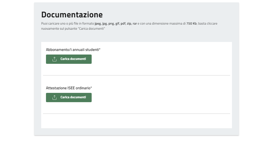 Caricare la documentazione richiesta cliccando su "carica documenti"
